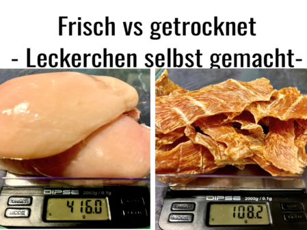 Hier zeige ich Euch auf, wie groß der Unterschied zwischen getrocknetem und frischem Fleisch ist. Ich trockne Fleisch-Leckerchen grundsätzlich selbst.